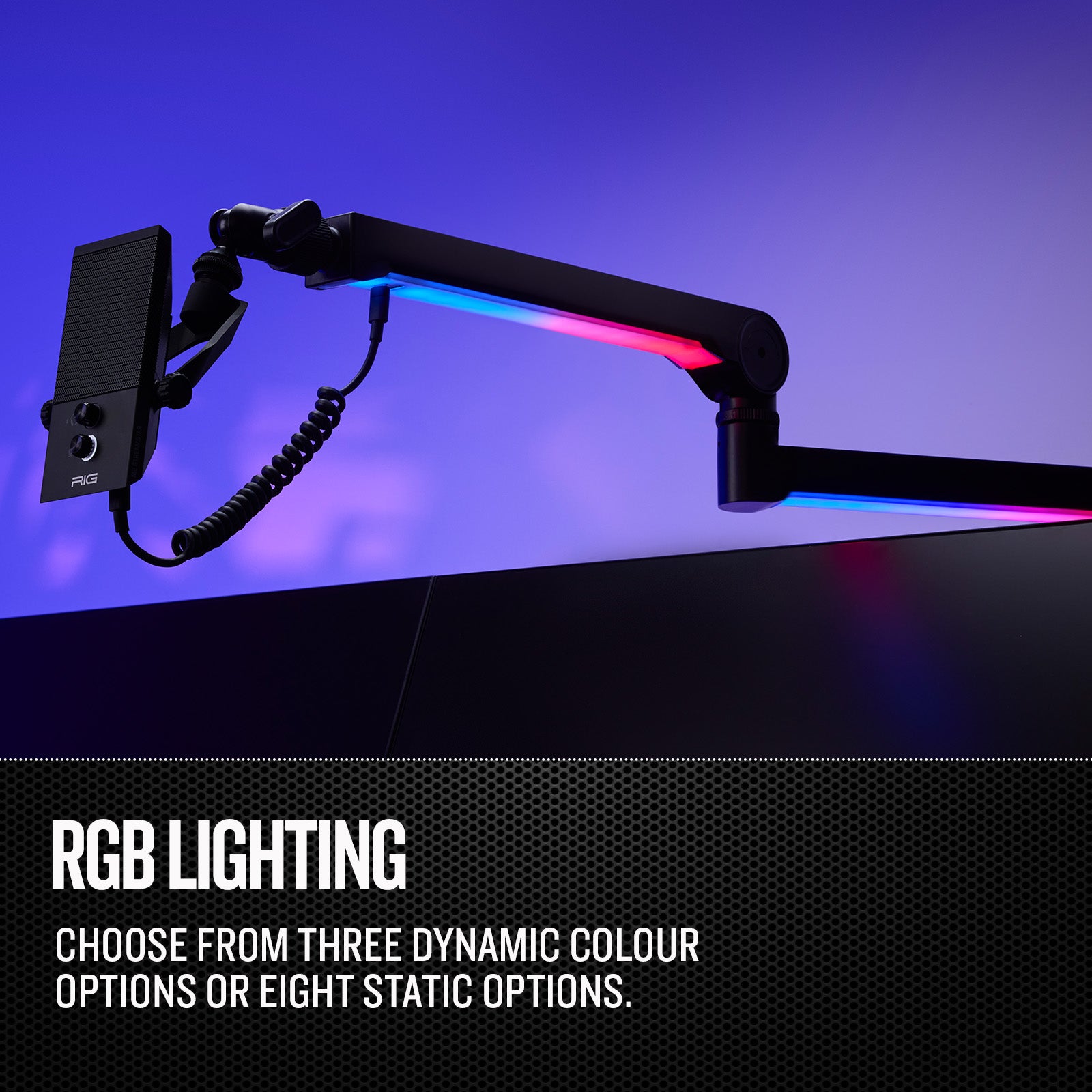 CRAFTED FOR YOUR CONTENT: MA-1 Boom Arm’s built-in RGB underlighting features three dynamic color options or eight static options.