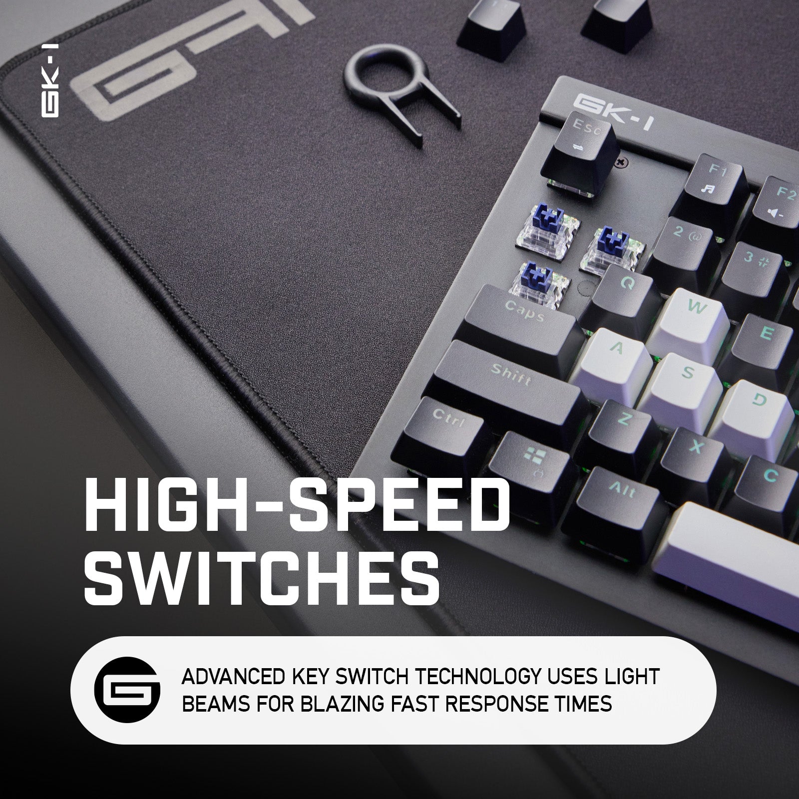 GK-1 KEYBOARD OPTICAL SWITCHES: Optical Switch technology uses light beams to trigger key actuation, giving players blazing fast response times.