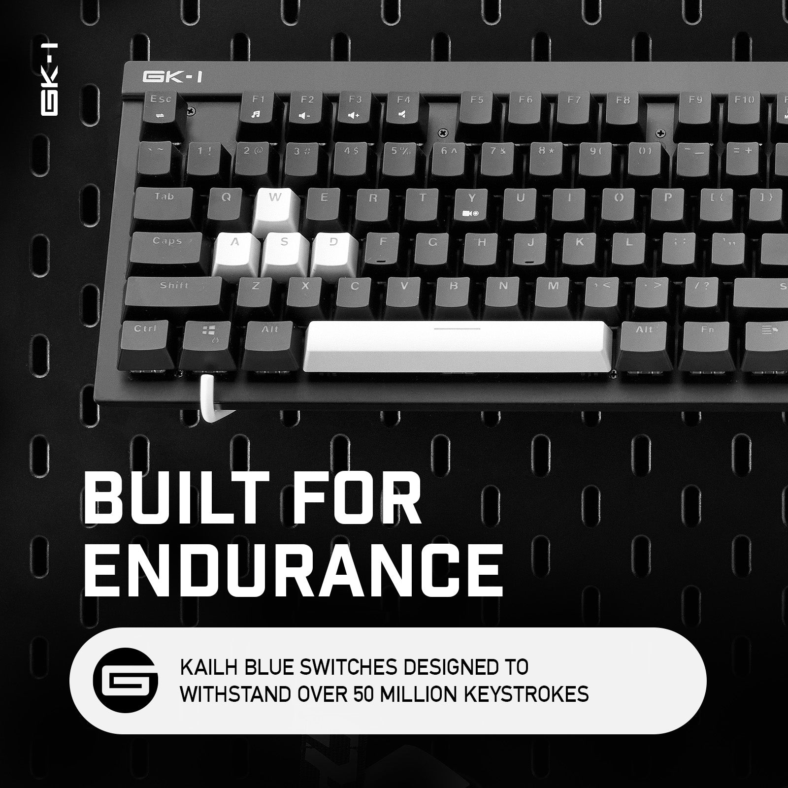 GK-1 DESIGNED FOR GAMING: Anti-ghosting technology registers every keystroke even when several keys are pressed simultaneously, allowing for advanced multi-key inputs during gameplay. Kailh Blue clicky switches designed to withstand over 50 million individual keystrokes while providing a tactile feel for responsive gaming and typing.