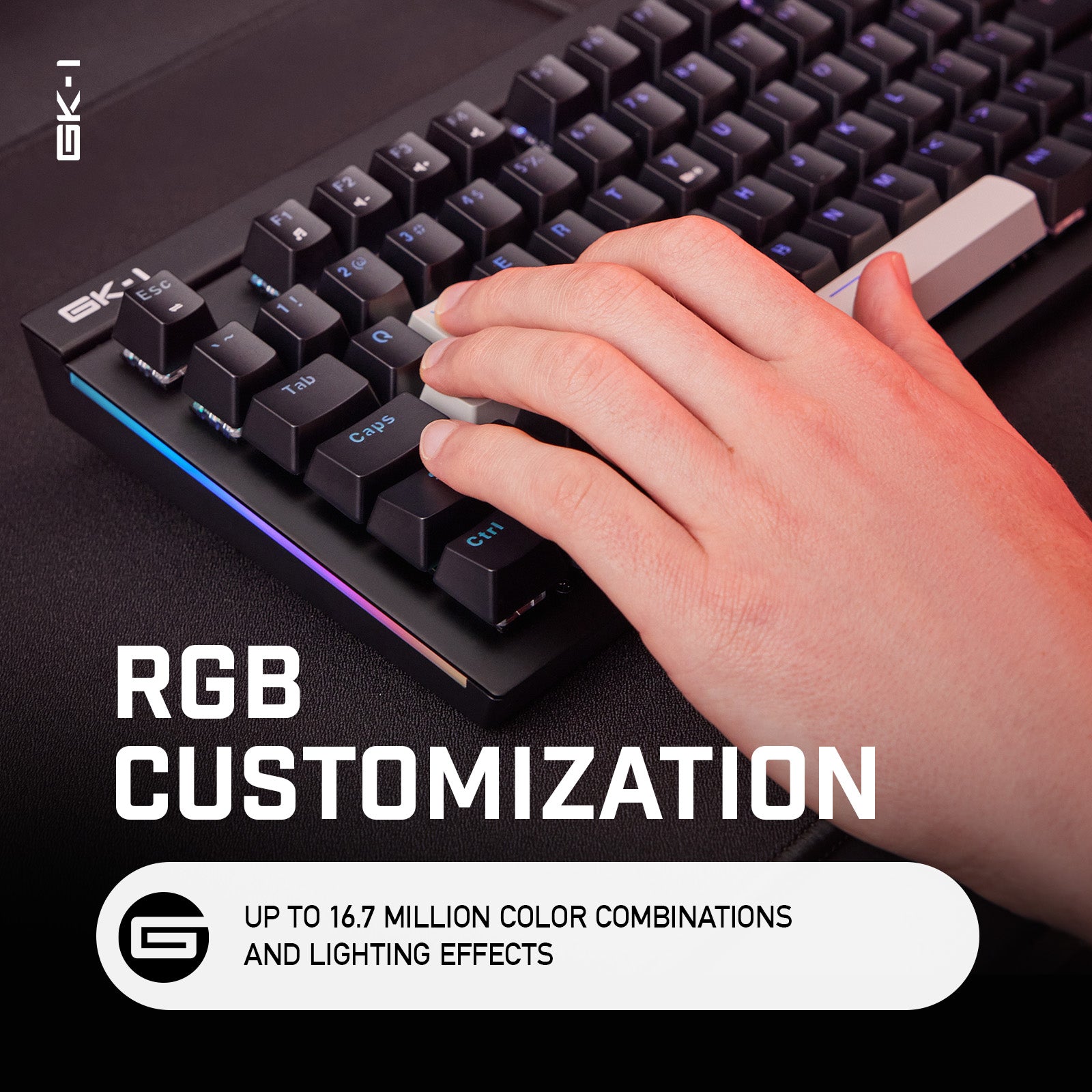 GK-1 RGB CUSTOMIZATION: Each key is back-lit via RGB lighting, which can be adjusted individually via GAMECOM GK-1 software for up to 16.7 million color combinations, as well as altering immersive lighting effects such as breathing, color patterns, and brightness.